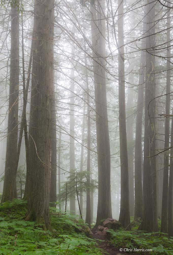 While walking through a cloud, I noticed a young cedar reaching for the sky among its elders. I set my tripod down and bent forward into my art. Soon after, as I contemplated the lives of those trees, the low cloud lifted and disappeared.