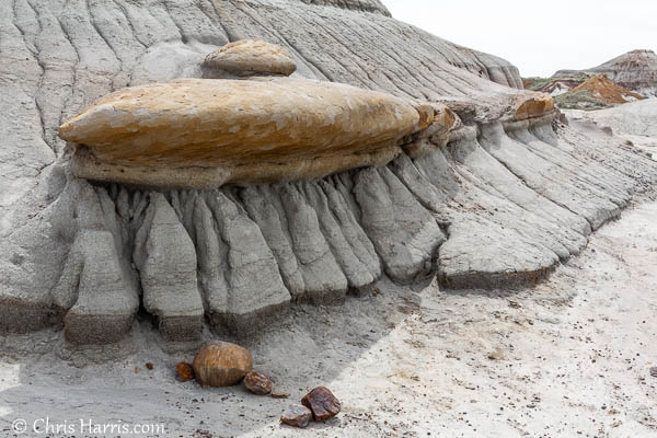 Hoodoos, or rock pinnacles, are found in several areas within the badlands. They come in many sizes and appear in areas where rocks are of different hardness. As a result of water and wind erosion, the hard caprocks protect the softer rocks beneath.